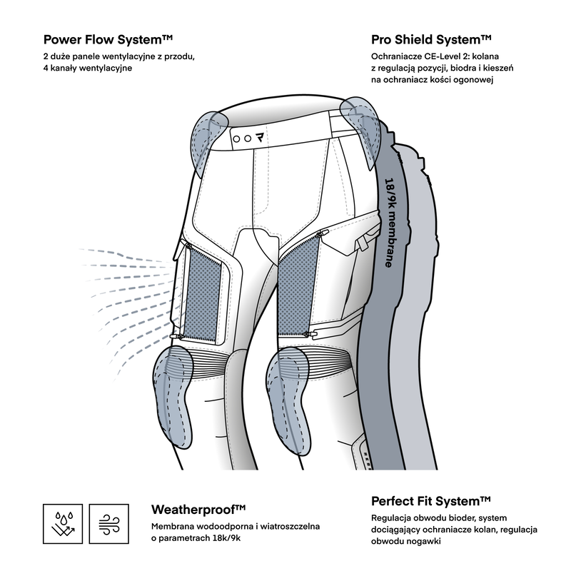 Materiał heat-resistant od wewnętrznej strony nogawek chroni przed gorącem z układu wydechowego