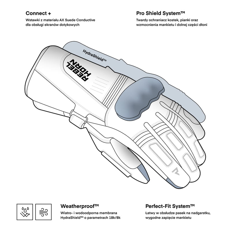 Rękawice posiadają wstawki ze skóry AX Conductive, dzięki którym możliwa jest obsługa ekranów dotykowych bez zdejmowania rękawic. Całość uzupełniają elastyczne elementy i wytrzymała konstrukcja, które zapewniają pełną swobodę ruchu podczas jazdy.