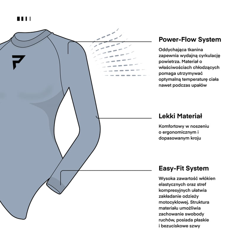 Body Freeze II Lady oferuje maksymalną elastyczność i dopasowanie dzięki wysokiej zawartości włókien rozciągliwych oraz stref kompresyjnych. Ergonomiczny, dopasowany krój doskonale współpracuje z ciałem, co jest szczególnie ważne podczas pochylonej pozycji za kierownicą motocykla. Materiał cechuje się również odpornością na zagniecenia, co ułatwia zakładanie i zdejmowanie odzieży motocyklowej oraz zapewnia długotrwały komfort.