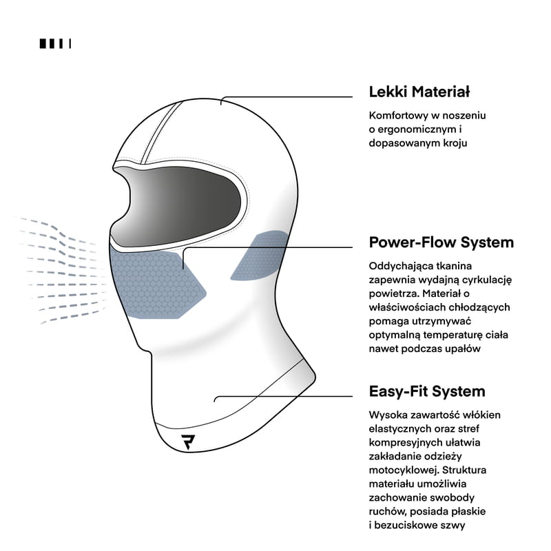 Płaskie, bezuciskowe szwy minimalizują ryzyko otarć, a specjalne strefy kompresyjne poprawiają dopasowanie do sylwetki, ułatwiając jednocześnie zakładanie i zdejmowanie odzieży motocyklowej. Ergonomiczny krój kominiarki dodatkowo podnosi wygodę noszenia.