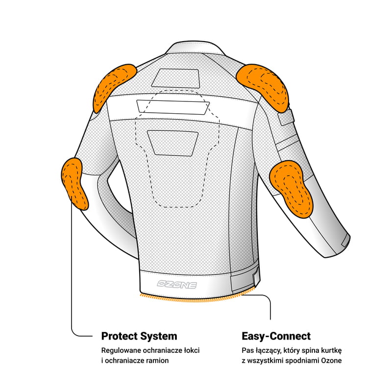 Krótki zamek umożliwia szybkie połączenie kurtki ze spodniami motocyklowymi.