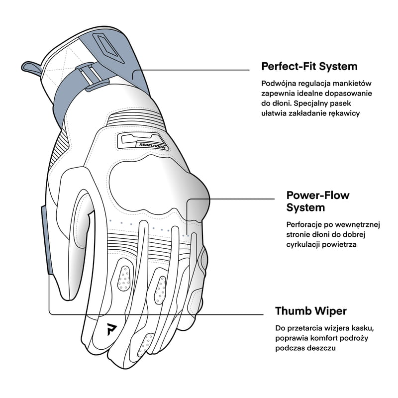 Model Rebelhorn Range Black został zaprojektowany tak, aby chronić dłonie motocyklisty w najbardziej newralgicznych miejscach.