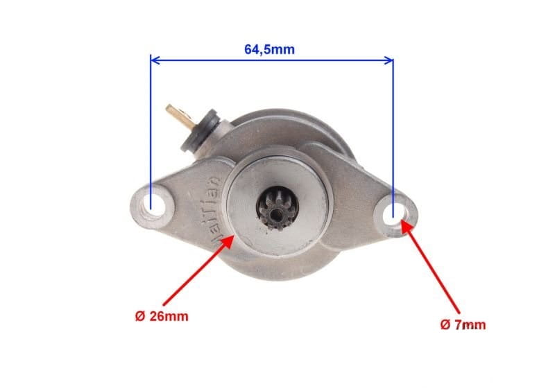 Rozrusznik elektryczny przeznaczony do skuterów 2T, wyposażony w 9 zębów oraz wałek o średnicy 9 mm i długości 16 mm. Posiada lewy (CCW) kierunek obrotu wałka, co zapewnia prawidłową i efektywną pracę układu rozruchowego. Rozstaw otworów montażowych wynosi 65 mm, a średnica osadzenia 26 mm, co gwarantuje łatwy i pewny montaż. Średnica obudowy to 47,5 mm, zapewniając kompatybilność z wieloma modelami skuterów.