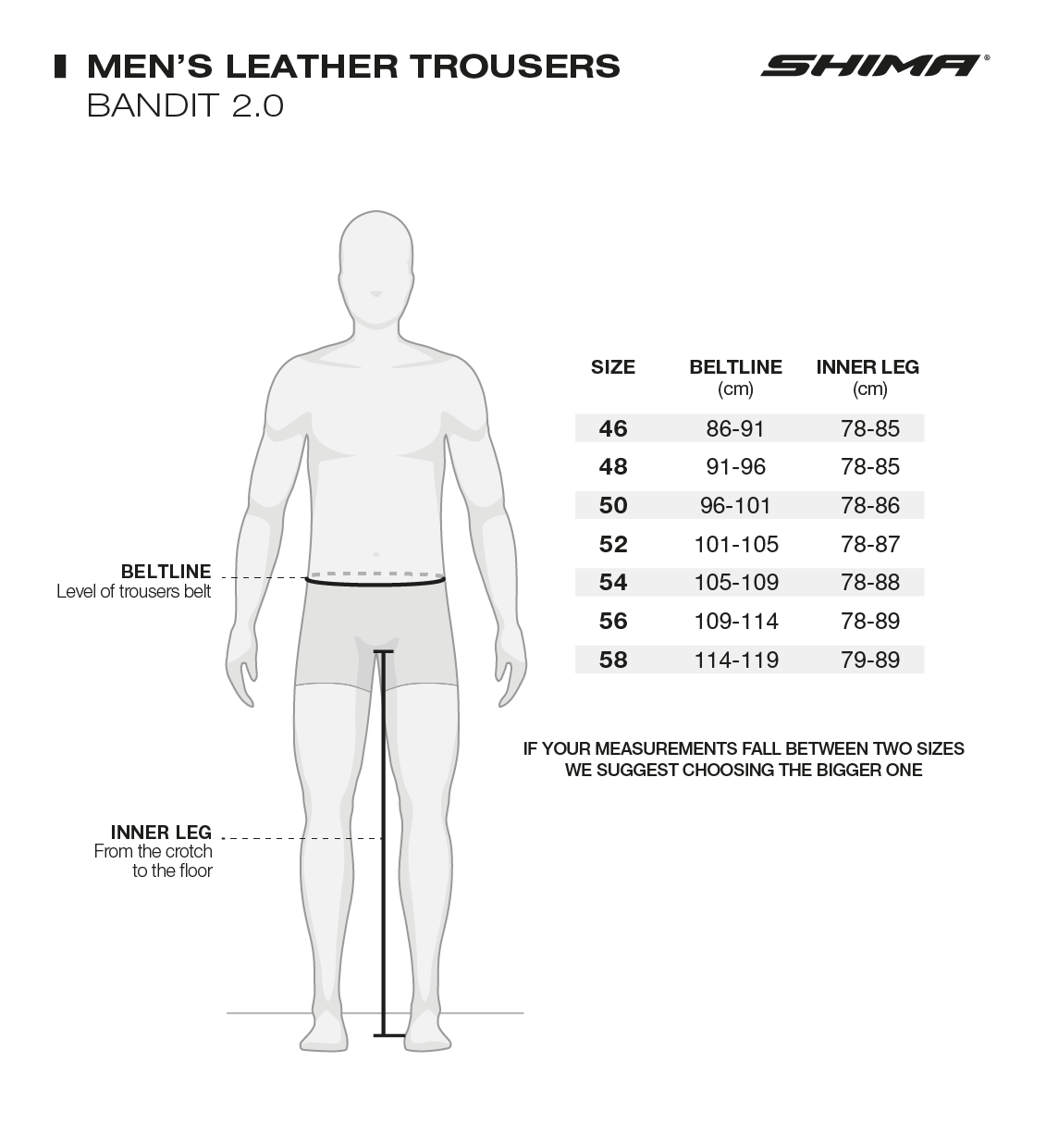Model SHIMA Bandit 2.0 Black to skórzane spodnie motocyklowe, które łączą miejski charakter z lekko sportowym stylem, idealne zarówno do codziennej jazdy, jak i dynamicznych wypadów. Wykonane z wysokiej jakości skóry bydlęcej, zostały wzmocnione dodatkową warstwą skóry w kluczowych miejscach, co znacząco podnosi ich trwałość i ochronę.