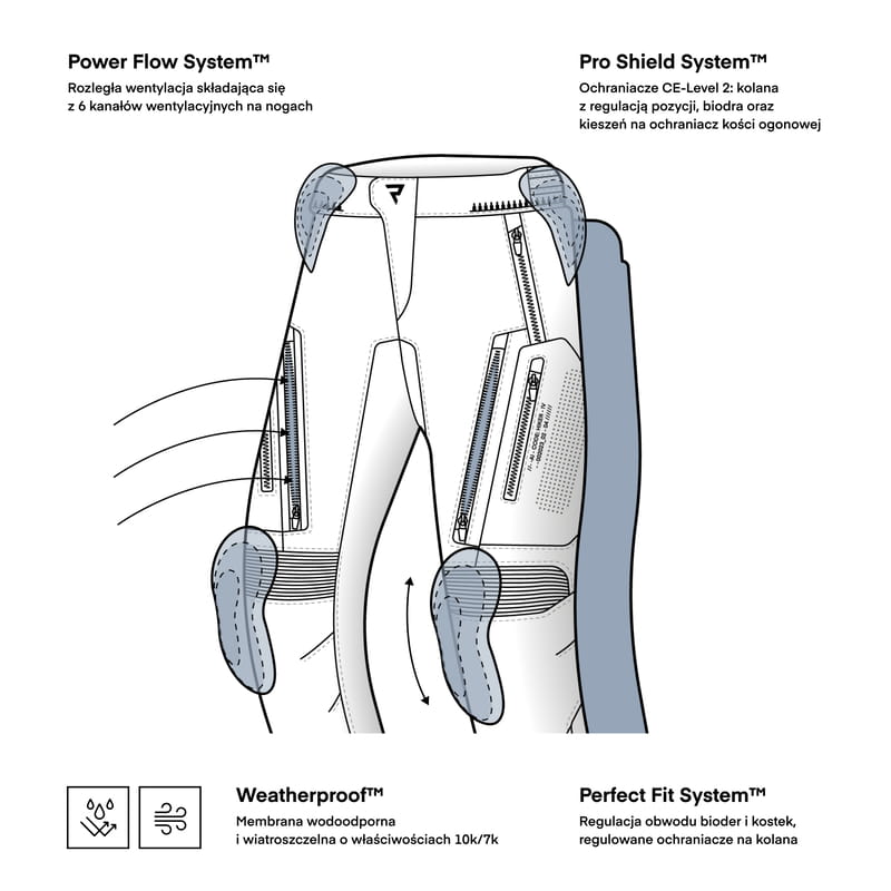 Spodnie idealnie komponują się z kurtką Rebelhorn Hiker IV, tworząc pełny zestaw motocyklowy zaprojektowany z myślą o długich trasach i zmiennej pogodzie. Po połączeniu zamkiem 8VST zyskujesz spójny, bezpieczny i funkcjonalny komplet turystyczny.