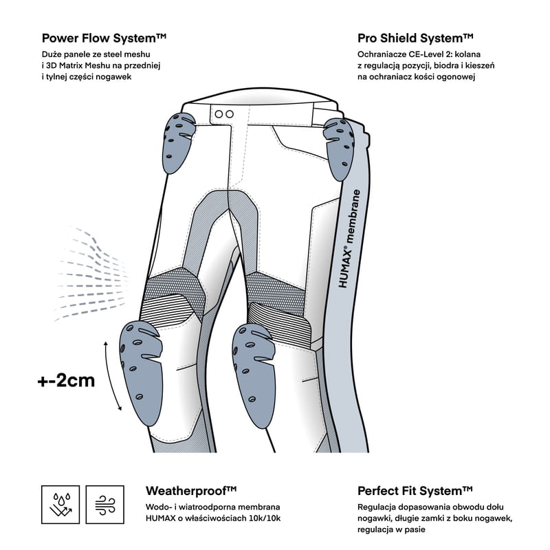 Za przewiewność odpowiadają duże panele wentylacyjne z materiałów 3D Matrix Mesh i Steel Mesh, które zapewniają doskonałą cyrkulację powietrza nawet podczas jazdy w wysokich temperaturach. Wypinana membrana Humax® 10k/10k skutecznie chroni przed deszczem i wiatrem, jednocześnie pozwalając skórze oddychać.